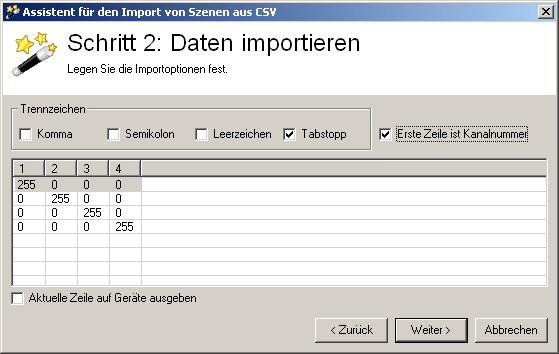 DMXControl 2, Manual, Kapitel "Szenen": Import aus CSV: Schritt 2 (Kanalnummern ausgelesen)